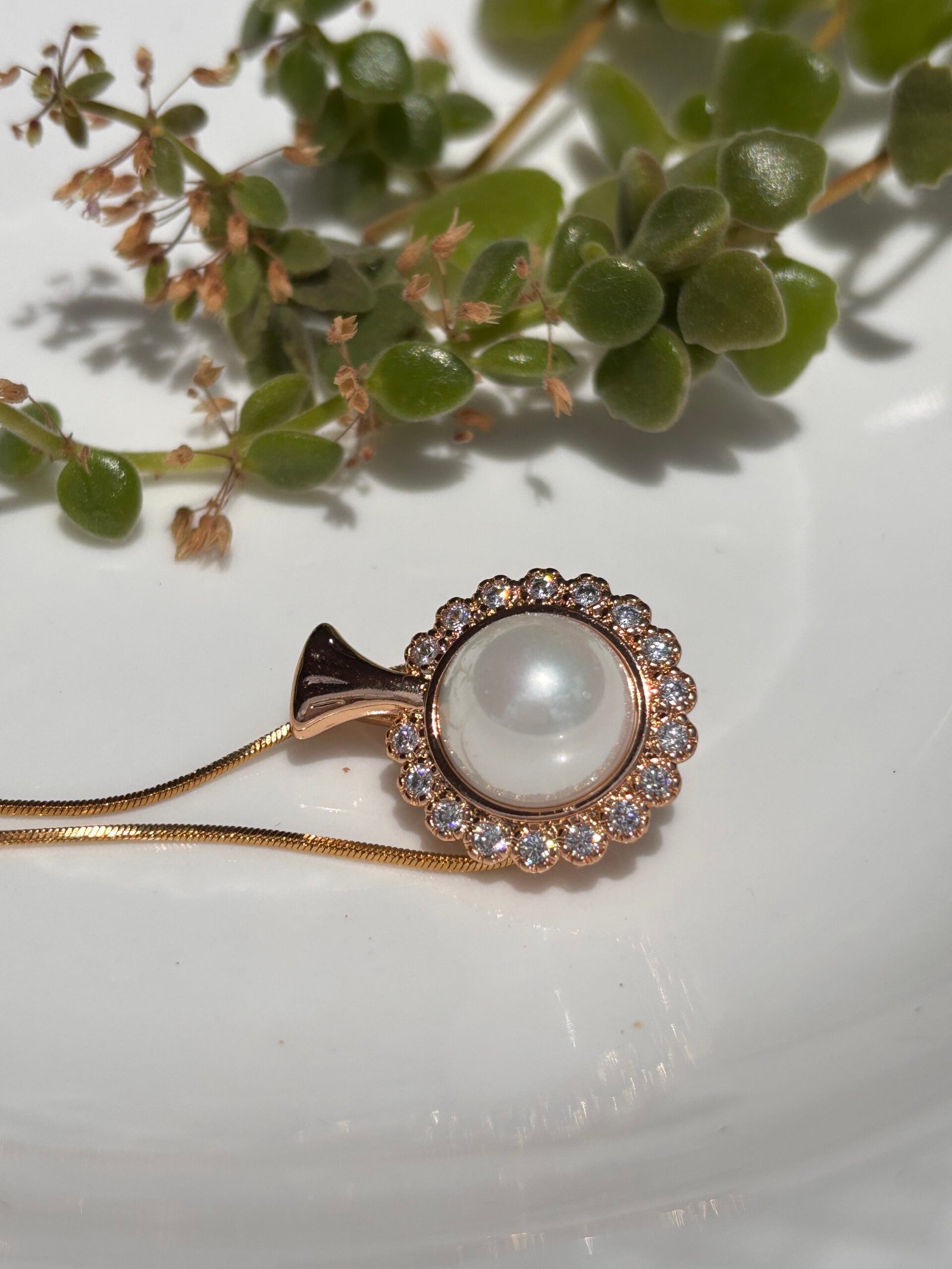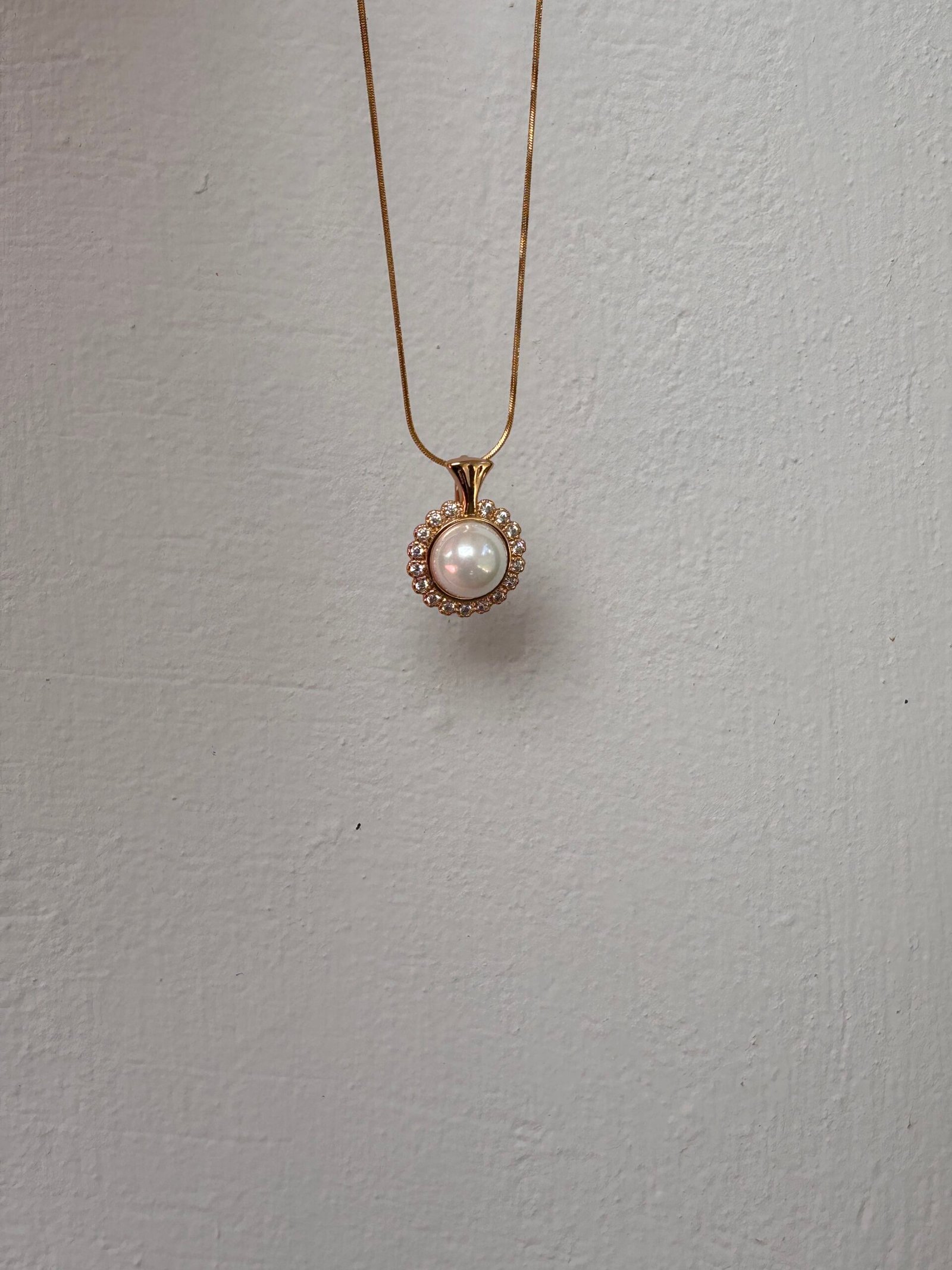Classic with a hint of celestial charm, the Luna Halo Pendant features a lustrous faux pearl encircled by a delicate ring of shimmering zirconia, all suspended on an 18k gold-plated chain.