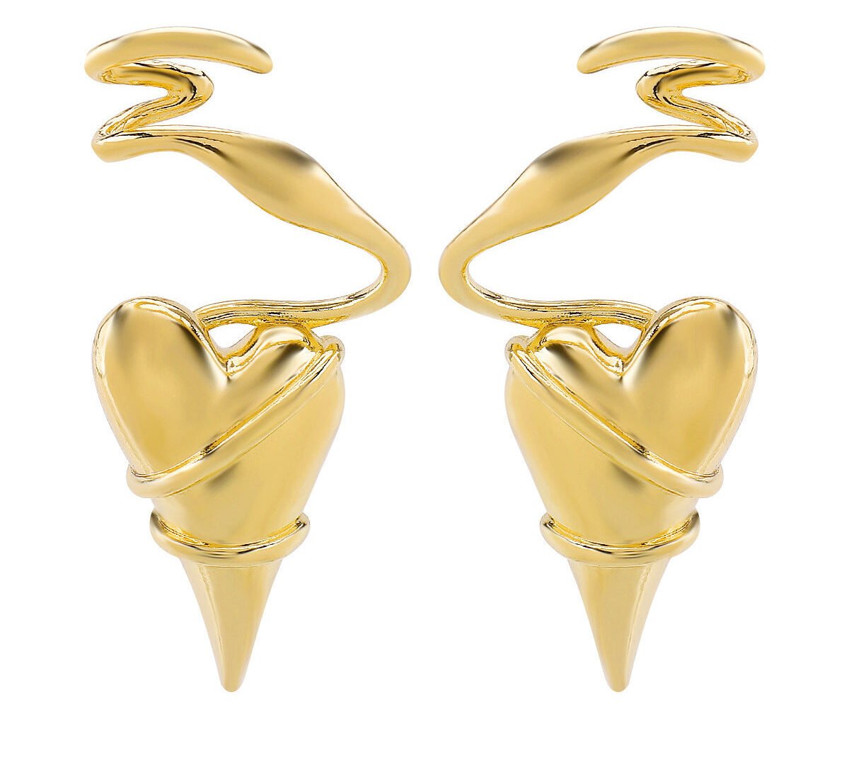 A bold take on romance. Featuring a sculpted heart that tapers into a sleek point and wraps in a smooth, liquid-like curve—these earrings balance softness with edge. Plated in high-shine gold, they bring an avant-garde twist to the classic heart silhouette, catching light and attention with every turn.
