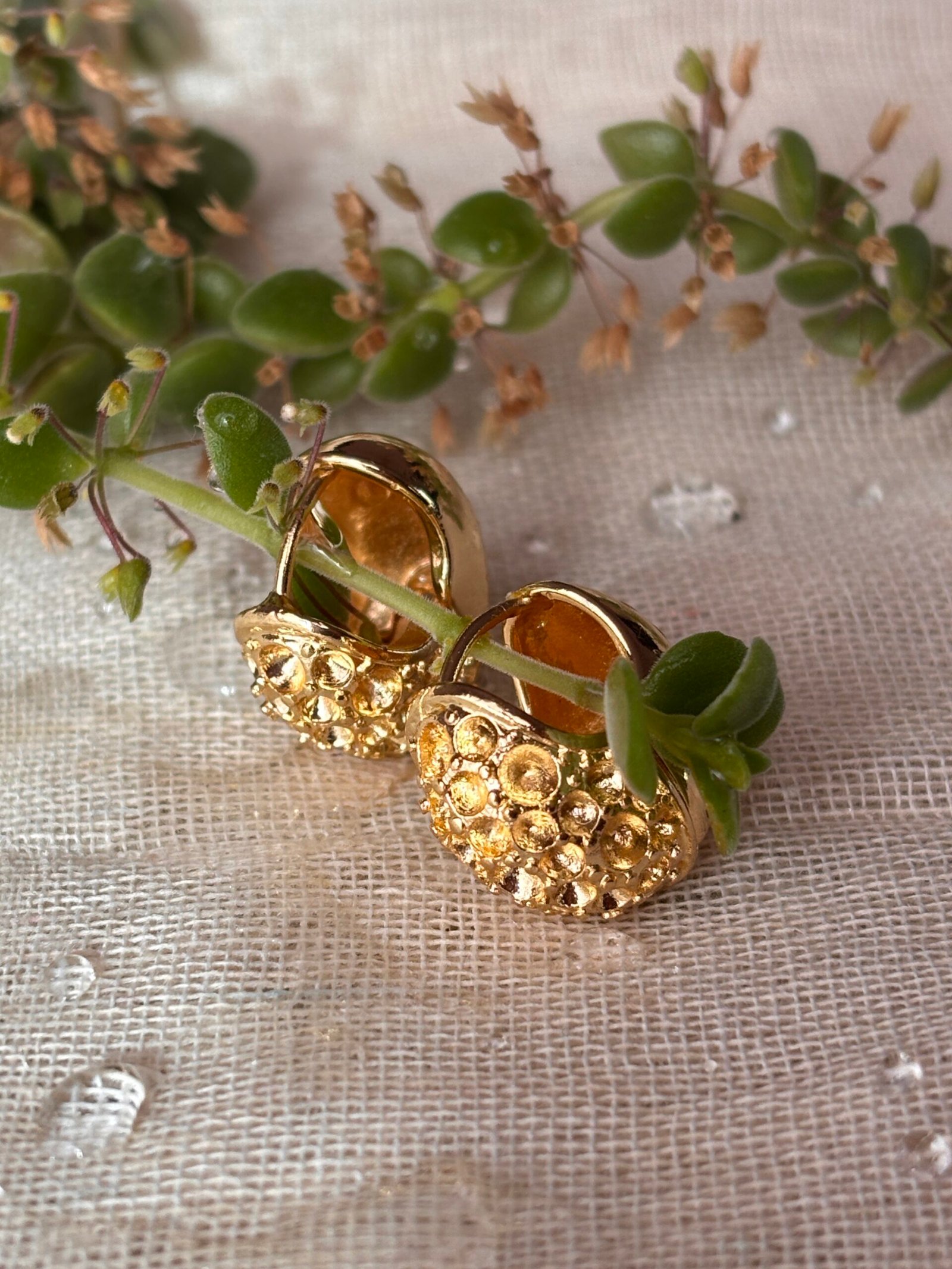Drizzle Dot Huggies (₹599) – Inspired by raindrops hitting the earth, these gold-plated huggie-style earrings feature a raised, bubble-like surface that catches light from every angle. Sculptural and stylish, they bring a natural, earthy feel to any wardrobe.