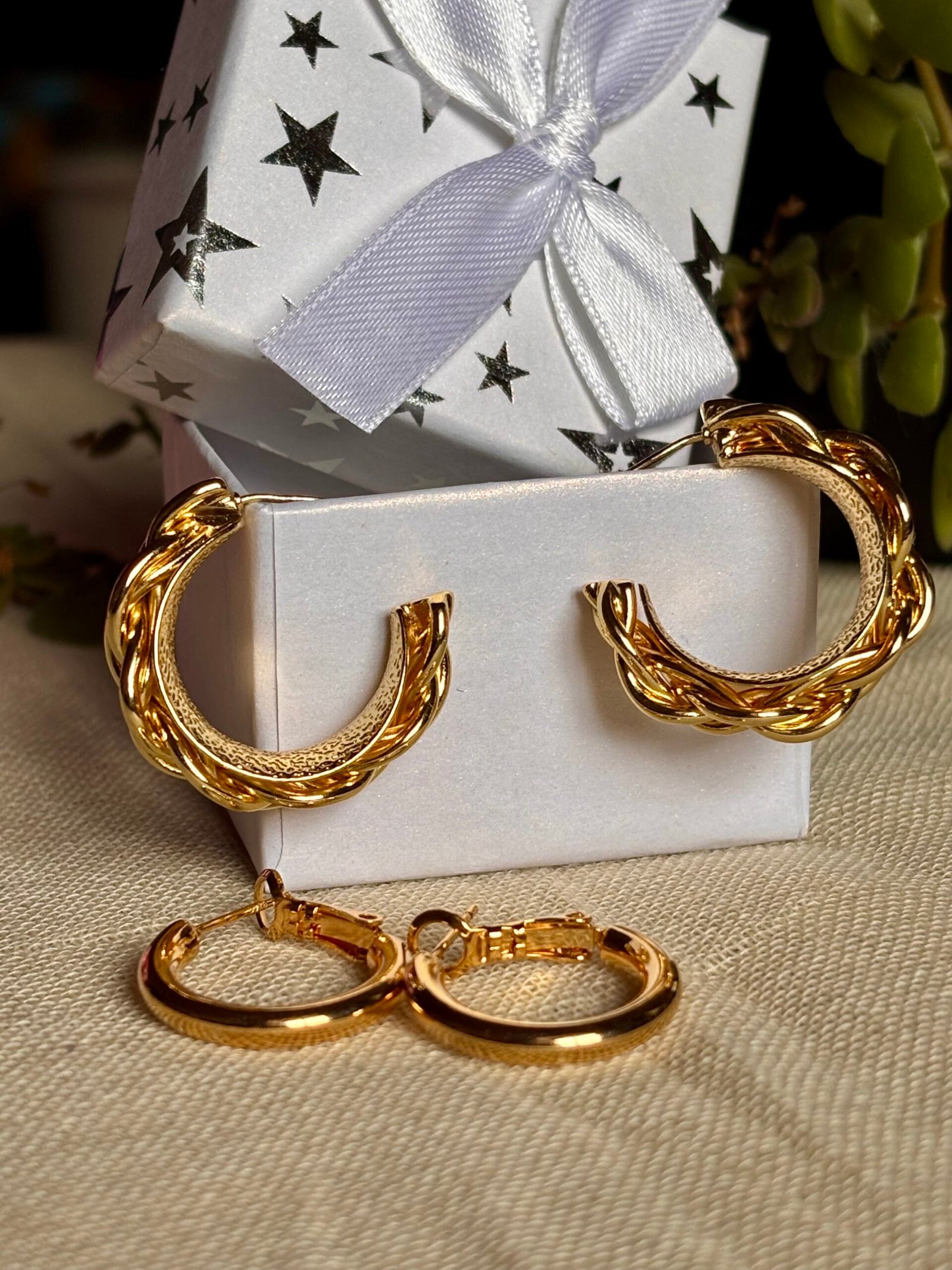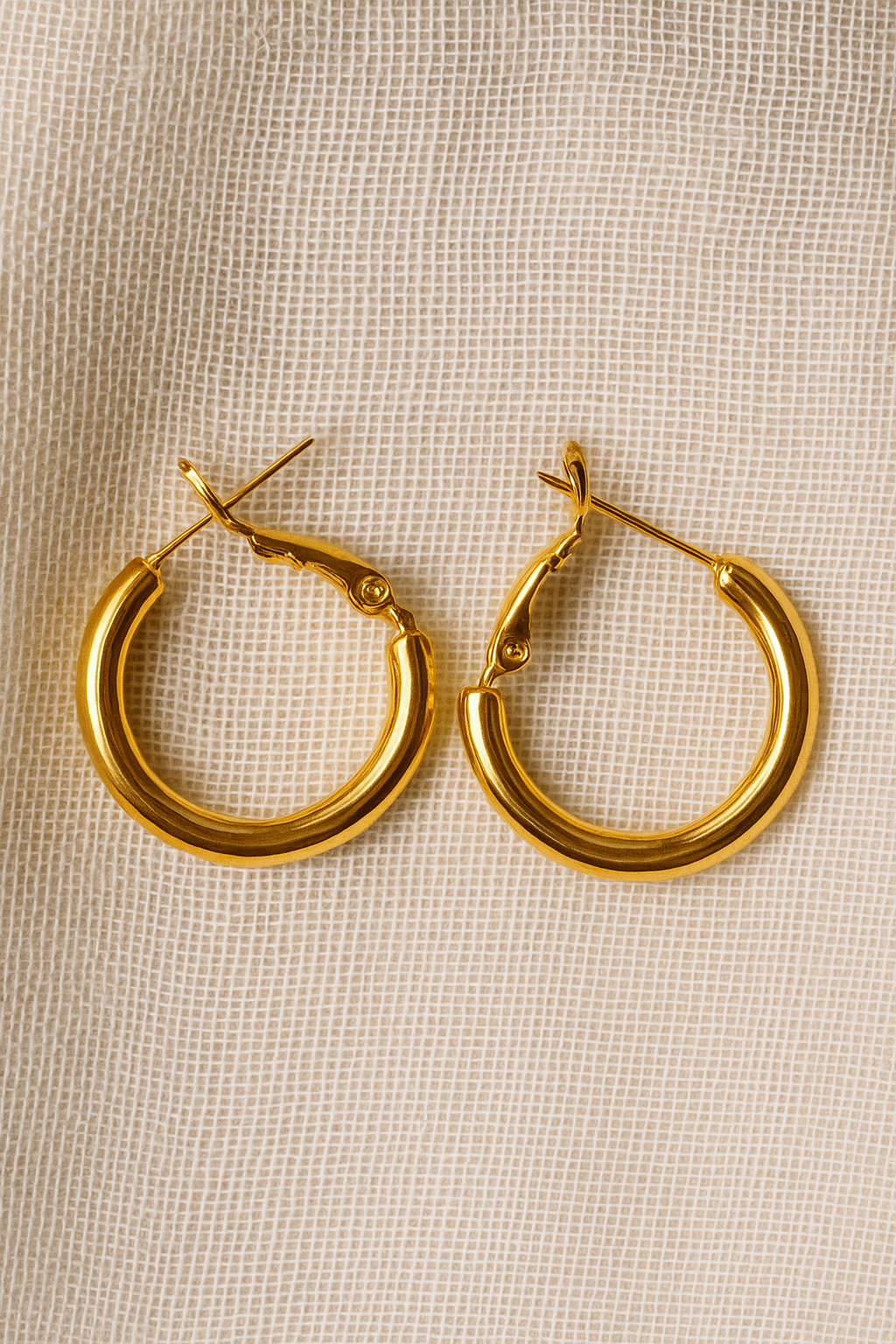 ✨ Classic Round Hoops (₹899) – A wardrobe essential in 24k gold plating, these lightweight gold hoops bring effortless sophistication to any look. From brunch to cocktails, they are versatile earrings every woman will love.
